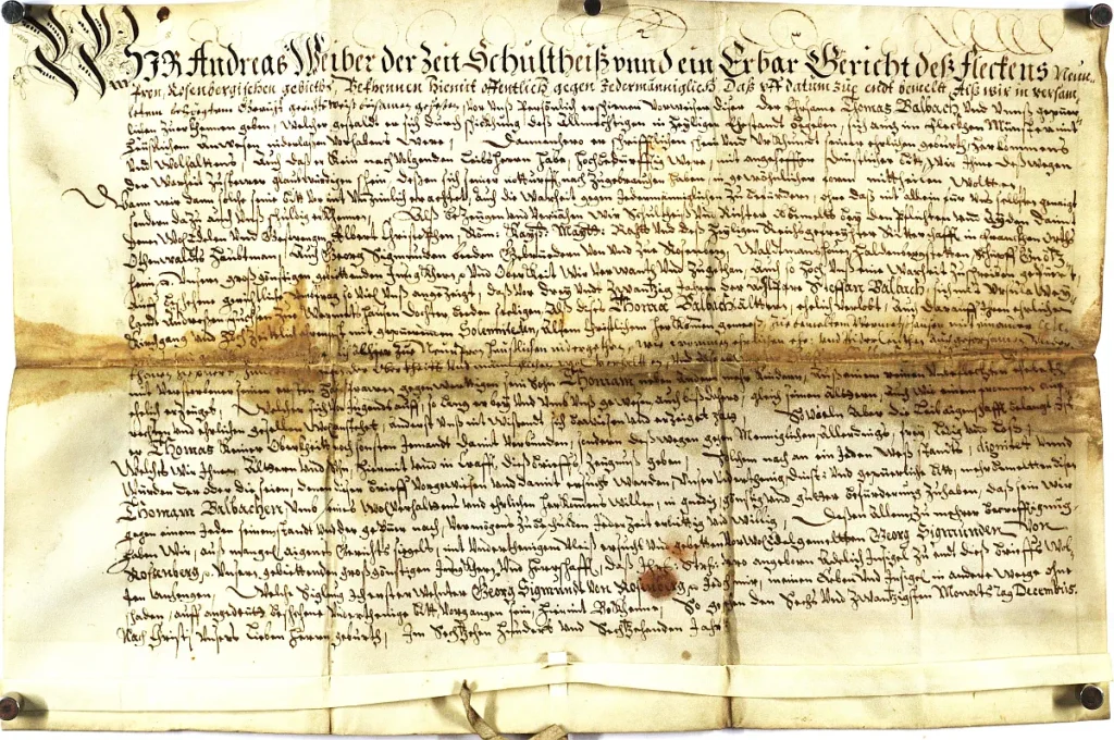 Wann wir dann solche seine Bitte vor untugendlich erachtet, auch die Wahrheit gegen jedermänniglich zu befördern […] als bezeugen und verjehen wir, Schultheiß und Richter obbemeldt, bei den Pflichten und Eiden, damit wir wol edelen und gestrengen Albert Christoffen, Röm. Kaiserliche Majestät und des Heiligen Reichs gefreiter Sutterchaft in Aranchen Ortho Odenwaldts Hauptmann, auch Georg Sigmunden, beiden Gebrüdern von und zu Rosenberg […] unsern großgünstigen gnädigen Junkherrn und Oberkeit […]