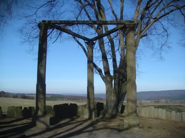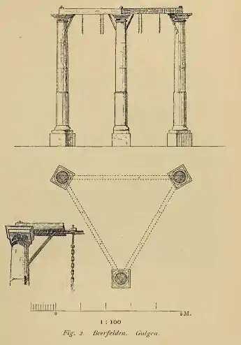 Für uns heutige Menschen ist der Anblick kaum zu ertragen. Der Galgen ist als Dreieck konstruiert. Drei sehr hohe Säulen aus rotem, buntem Sandstein ragen in die Höhe und sind oben mit Balken verbunden. Diese Bauweise war nicht nur stabil, sie war effizient auf grausamste Weise: An diesem Galgen konnten bis zu neun Menschen gleichzeitig gehängt werden.